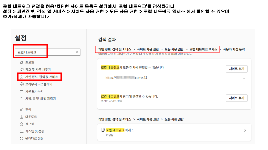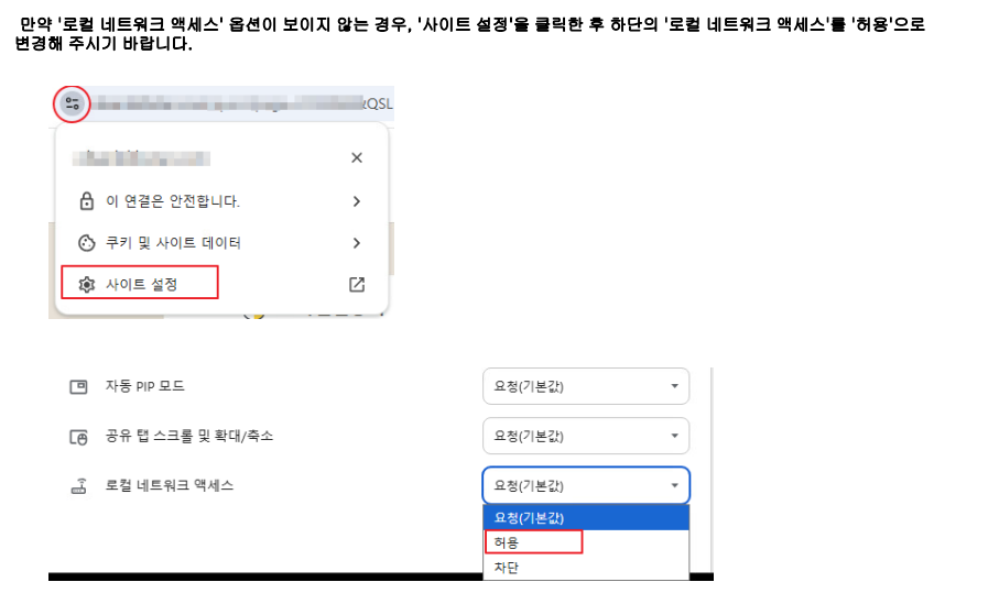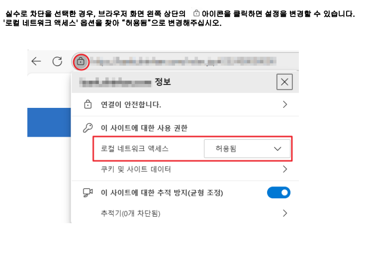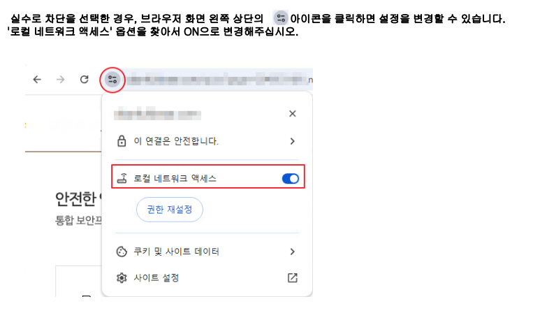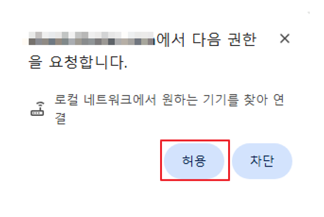 크롬/엣지 브라우저 141 버전으로 업데이트시, 로컬 통신에 대한 허용/차단 메세지가 나타나도록 기능 추가되었습니다. (윈도우/맥OS 모두 동일)
